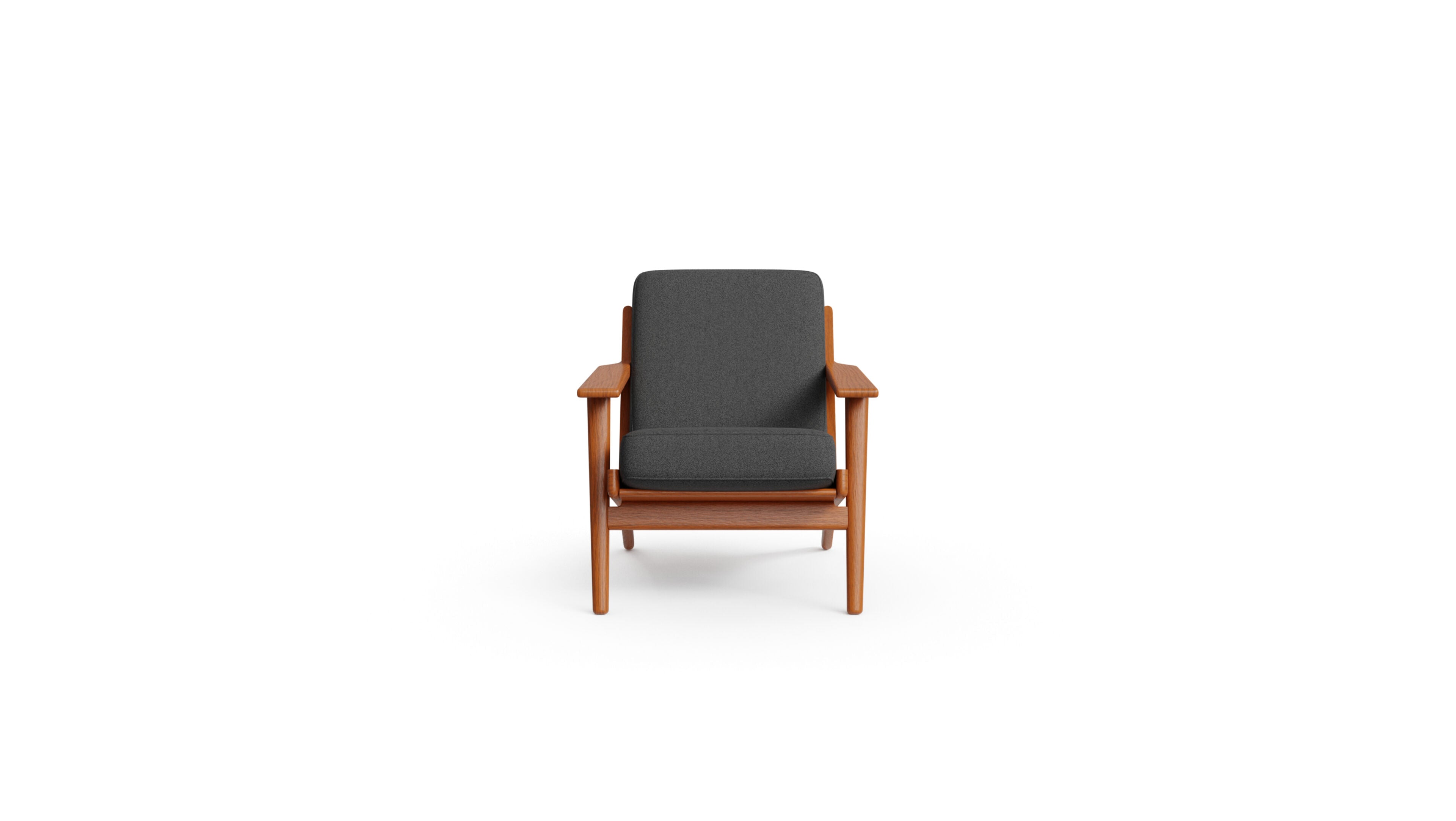 The Archetype Forms Plank Armchair frame is constructed from solid hardwood—oak is standard, with walnut and other wood species available as alternatives. The backrest consists of horizontal wooden slats that provide visual rhythm and flexible support. Each plank is individually fitted to allow slight give when seated. The armrests curve organically from the vertical rear posts and terminate in rounded ends. Upholstered cushions cover the seat platform and back, available in custom leather or fabric. Wegner designed the plank armchair with exposed joinery as a deliberate aesthetic choice, following Danish craft traditions. Our AF290 is reproduced to Wegner's original specifications, with advanced material customization options available.