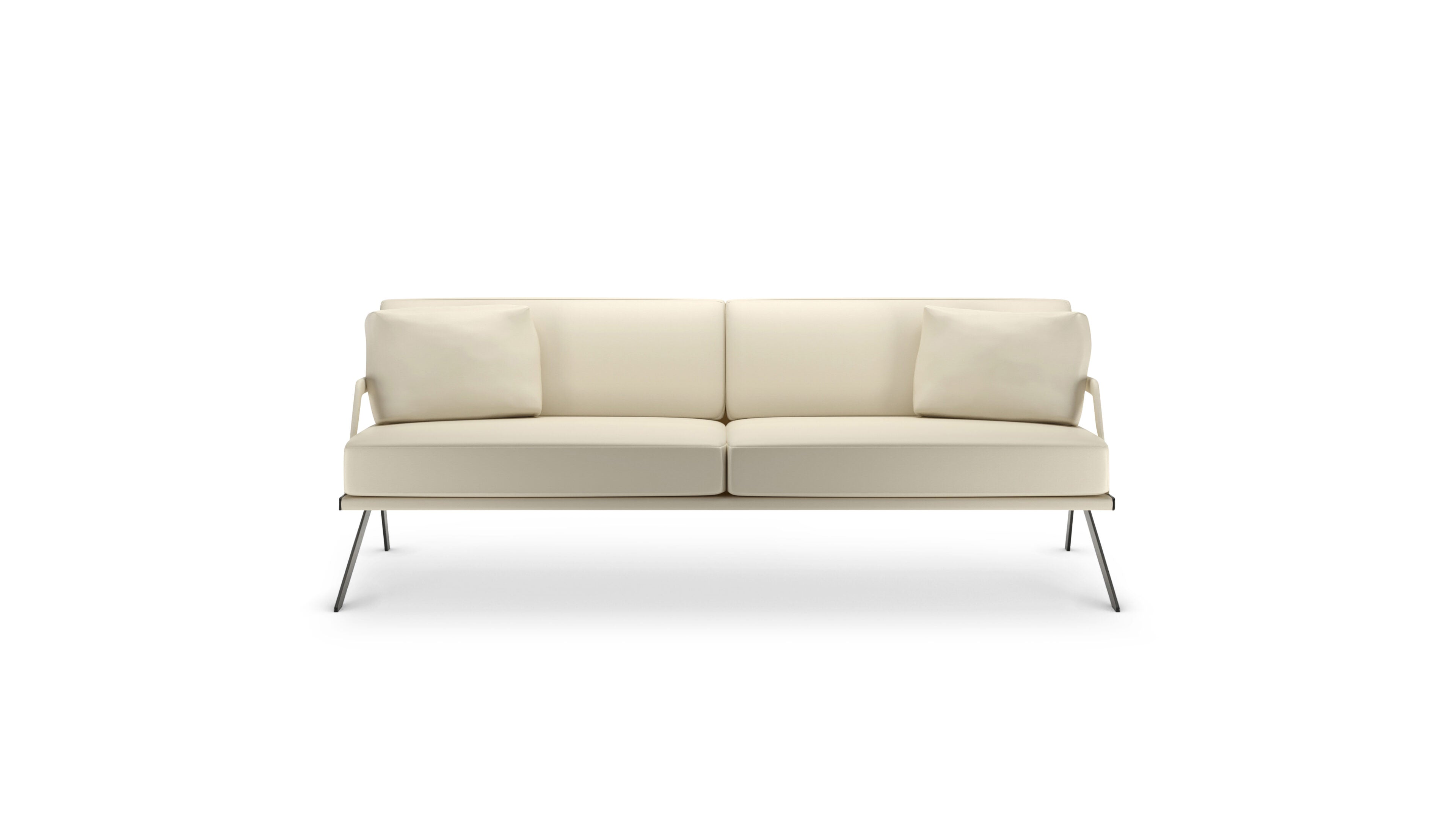 This 2-seat sofa model is built on a stainless steel frame available in a variety of finishes and furniture upholstery options, including leather, suede, or fabric with distinctive decorative seams.