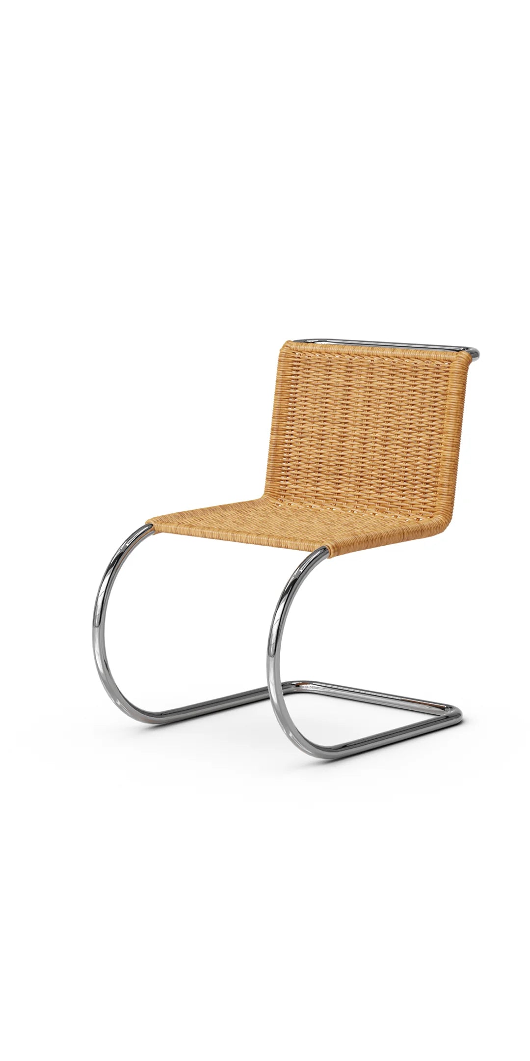 The MR Side Chair with Cane Rattan was designed by Ludwig Mies van der Rohe as part of his iconic MR Collection. First introduced at the influential Stuttgart Weissenhof Estate exhibition in 1927, this chair combines the structural innovation of tubular steel with the natural lightness of cane rattan.