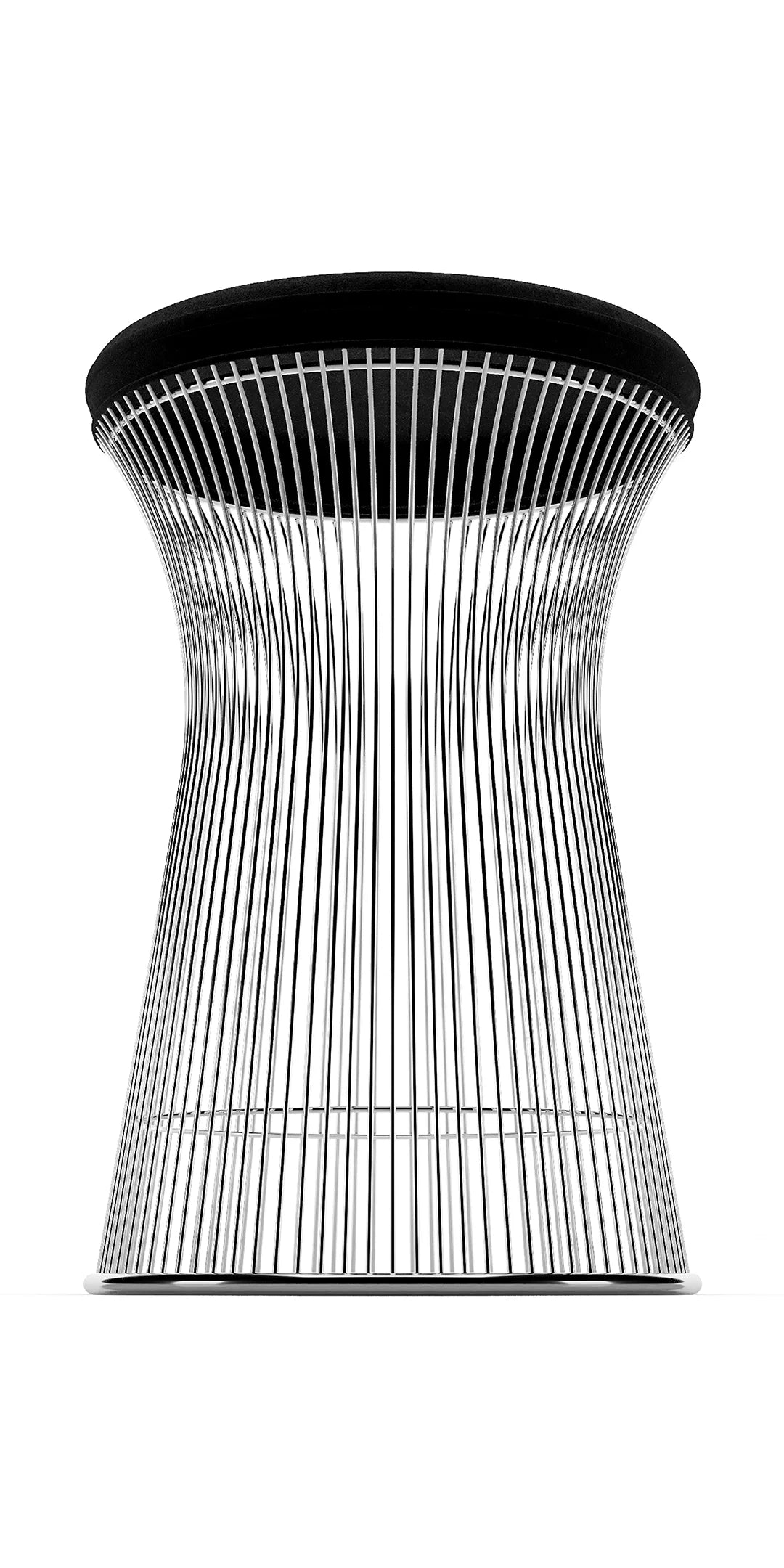 The timeless and elegant Platner Stool is a multifunctional piece, serving as a seat, footrest, or soft side table. Its iconic design features a sculptural base of curved steel rods welded to circular frames, requiring over 1,000 welds to create its intricate structure.