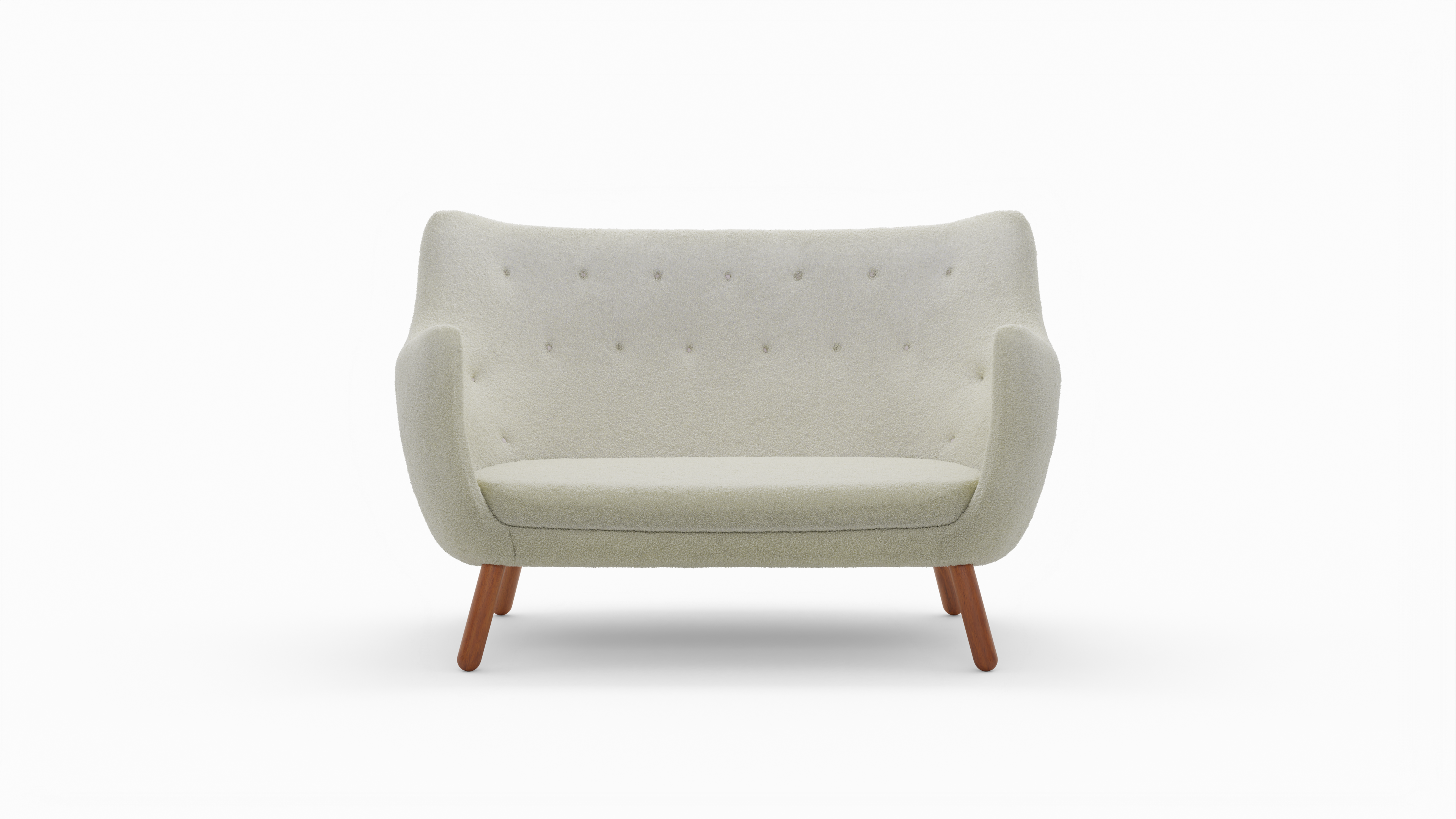 The Poet Sofa is recognized for its and its slim, tight padding and sculptural form, where the backrest curves frontward creating a false enclosure. The sofa's compact size and organic form facilitate intimate seating while making it ideal for modern living spaces, demonstrating Juhl's ambition to create functional furniture for smaller homes.