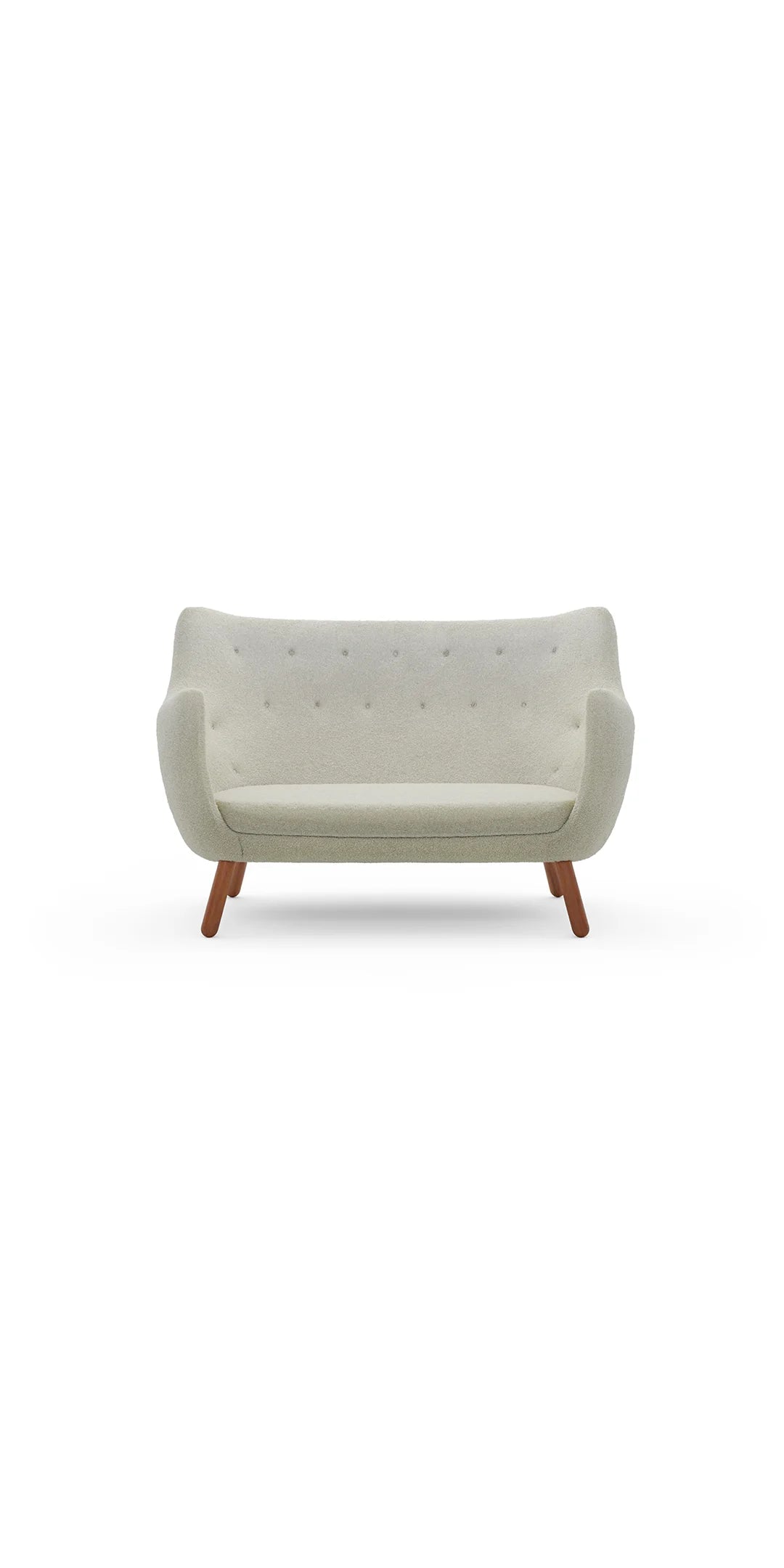 The Poet Sofa was originally designed by Finn Juhl for his own home, later exhibited at the Copenhagen Cabinetmakers' Guild Exhibition. This small, two-seater sofa draws inspiration from surrealist art, reflecting Juhl's commitment to combining art with functionality.